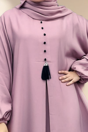Experience elegant simplicity with our Minimalist Pink One-Piece Abaya, designed for women who love clean, modest fashion. Made from soft, flowy fabric, this abaya features a sleek silhouette with delicate black buttons and a decorative tassel on the chest. The subtle gathers at the cuffs add to its graceful look while offering a comfortable fit.