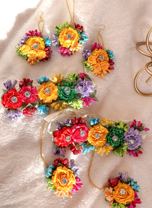 Each piece in this set is made with high-quality materials, ensuring that they will last for years to come. Whether you're a bride or a guest, this Gajra set is the perfect accessory for any mehndi or mayoun celebration. The beautiful floral colors are versatile and will complement a variety of outfits, making this set a must-have for your special occasion. Don't miss out on this stunning 5 piece Gajra set!