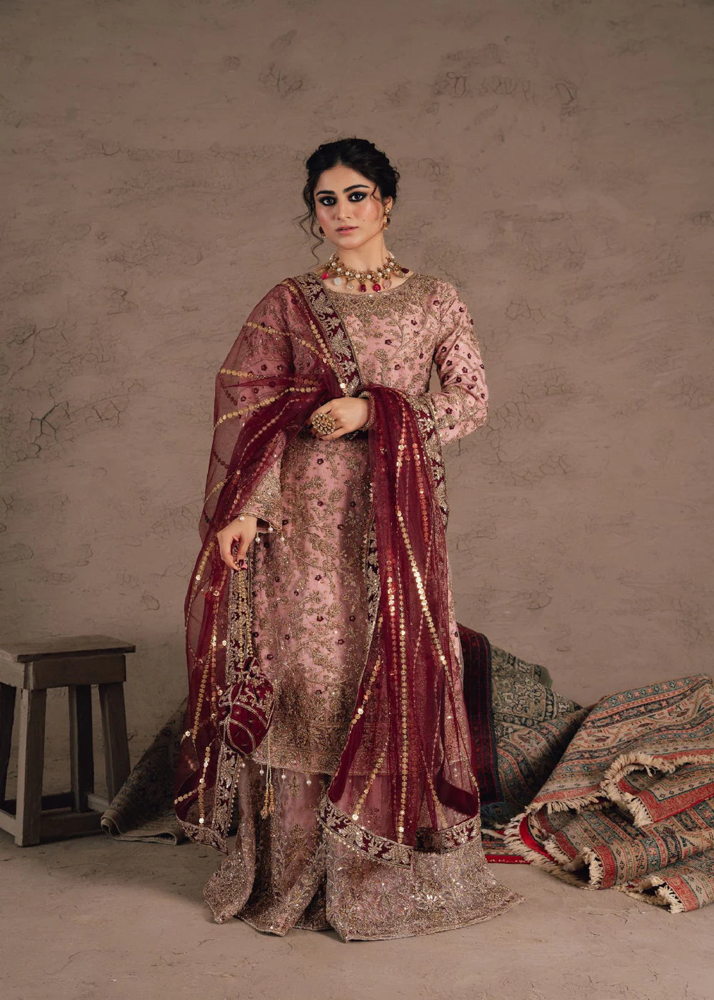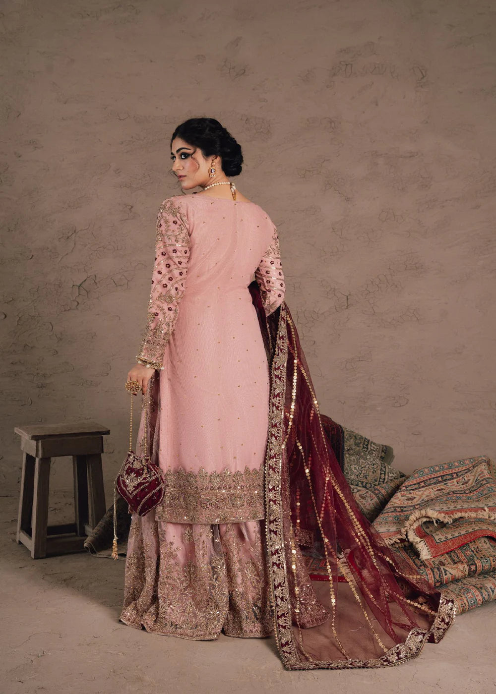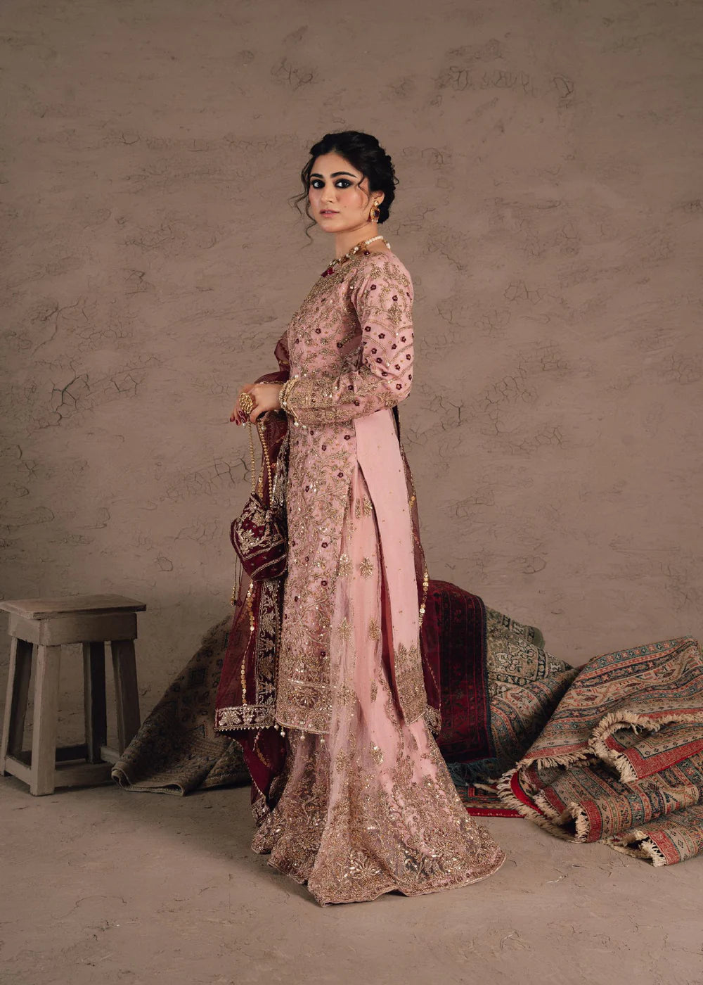 A timeless festive look crafted with elegance. This Pastel Pink Organza Embroidered Sharara Set features delicate hand-embellished details, a beautifully structured silhouette, and a graceful net dupatta that completes the entire ensemble. Designed in premium organza fabric, the outfit brings effortless charm—perfect for weddings, mayun, mehndi events, and festive gatherings.