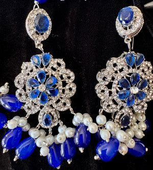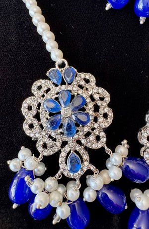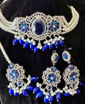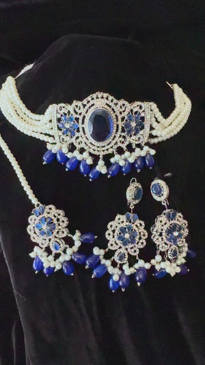 Enhance your look with this stunning choker set, designed with a delicate blend of white and blue pearls for a soft, graceful touch. Perfect for weddings, festive events, and special occasions, this set adds a touch of elegance to any outfit.