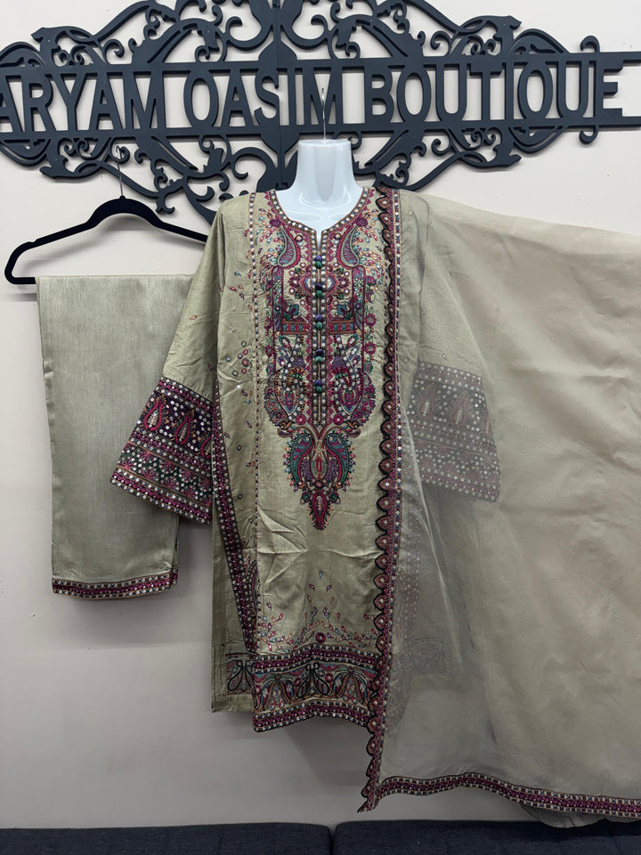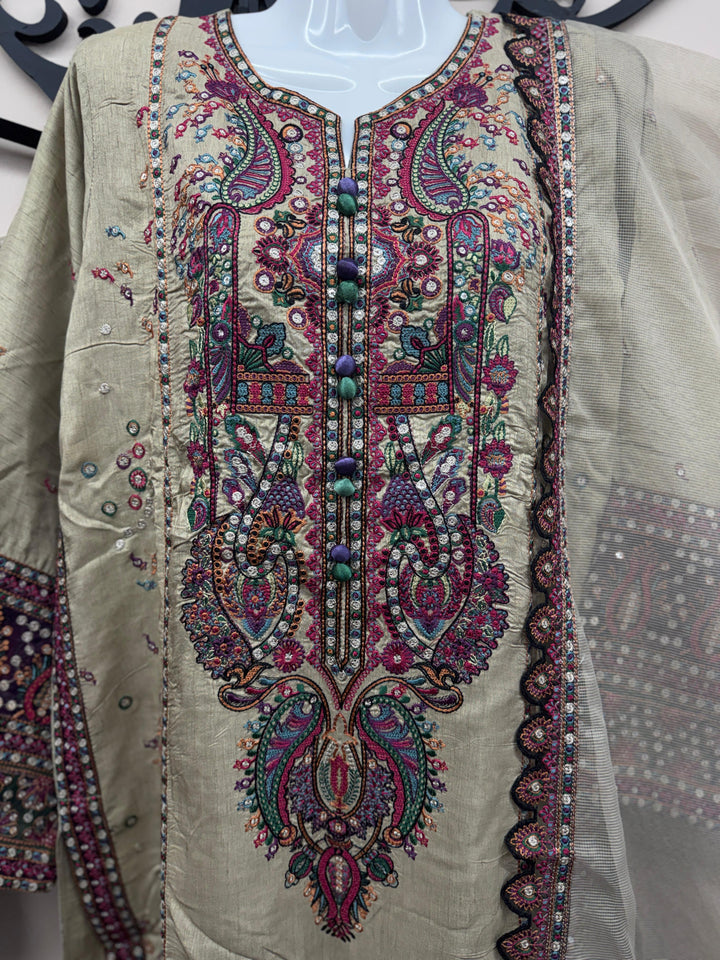 Elevate your All season wardrobe with this elegant Beige Embroidered 3-Piece Lawn Kurta Set. Designed for festive and party occasions, this ready-to-wear outfit features a medium-length straight kurta beautifully detailed with delicate embroidery, paired with a flared trouser and a lightweight organza dupatta that completes the look. The breathable  silk fabric ensures comfort and style during warm days, while the beige tone adds a touch of subtle sophistication — perfect for both day and evening events.