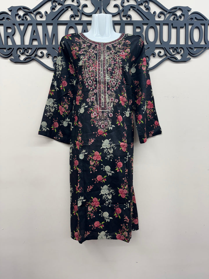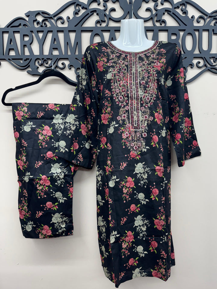 Step into summer elegance with this 3-piece lawn suit featuring a vibrant colorful floral print on a classic black base. The shirt is designed with front and back same print and finished with delicate neck embroidery for a timeless touch. It comes with matching printed lawn trousers and a full-size chiffon printed dupatta with black lace on all four sides, making it an ideal pick for both casual wear and festive gatherings. Manufactured by Erum Eman