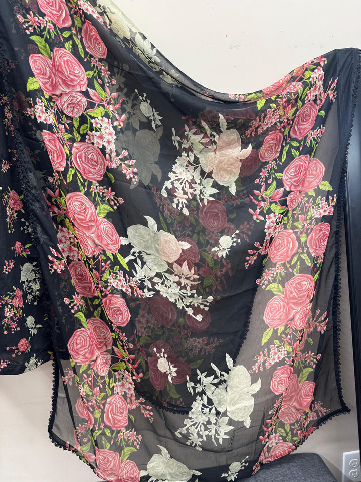Black Floral 3-Piece Lawn Suit with Embroidered Neck & Printed Chiffon Dupatta