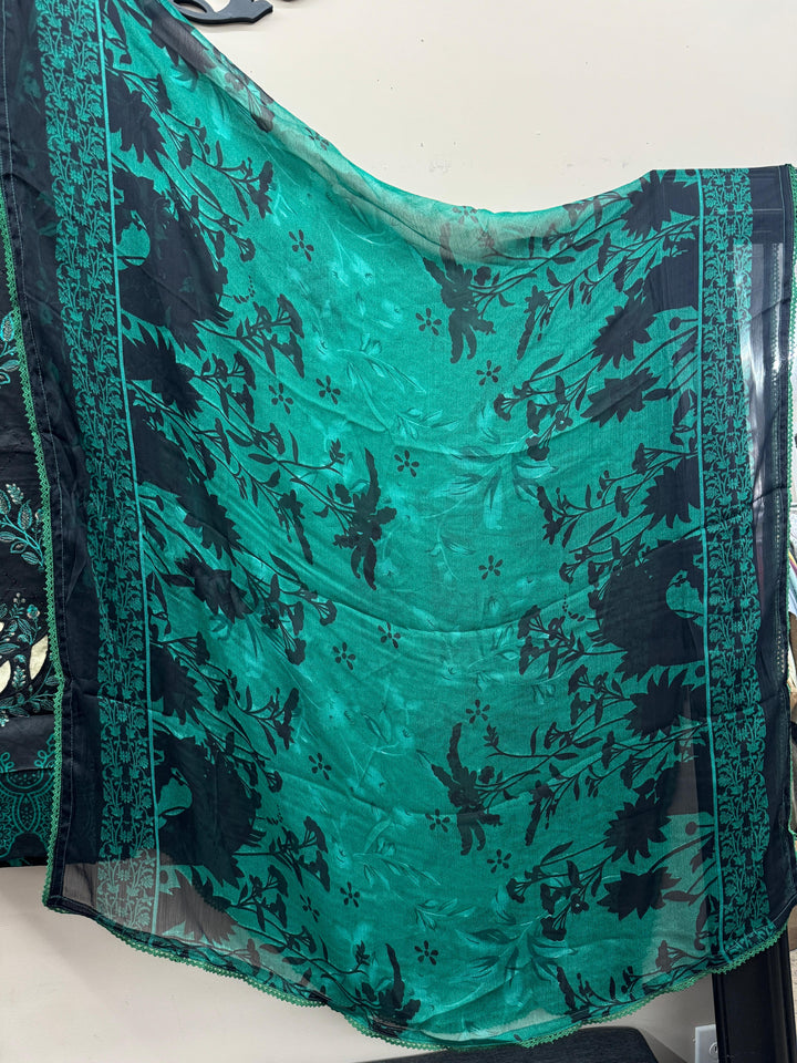 Make a bold style statement with this black and green 3-piece lawn outfit designed with elegance and comfort in mind. The shirt features a striking floral print with detailed front embroidery, paired with matching lawn trousers for a complete look. The outfit is beautifully finished with a printed chiffon dupatta, adding flow and grace. Crafted from non-see-through breathable lawn fabric, this suit is perfect for summer wear. Manufactured by Erum Eman