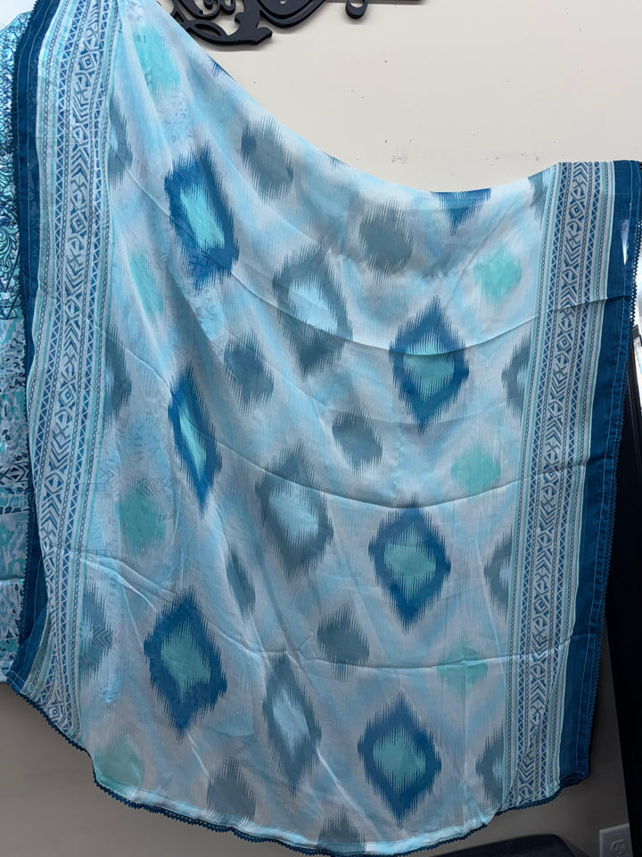 Refresh your wardrobe with this stylish blue 3-piece lawn outfit, featuring a printed lawn shirt with embroidered neckline and geometric patterns, paired with a plain matching lawn trouser for balance. The lightweight chiffon dupatta with blue-toned digital print and four-sided lace finishing adds a graceful touch. Made with breathable non-see-through fabric, this outfit is perfect for daily wear or casual gatherings. Manufactured by Erum Eman