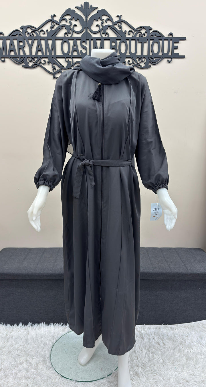 Stay stylish and modest with this front-open abaya featuring a full zipper. Designed with convenient side pockets, a fashionable belt, and a matching hijab, this abaya combines functionality and elegance. Perfect for daily wear, casual outings, or formal events, it offers comfort, ease of movement, and a modern look. Crafted from high-quality fabric for a smooth drape and long-lasting wear. Available in three elegant colors to suit every style preference.