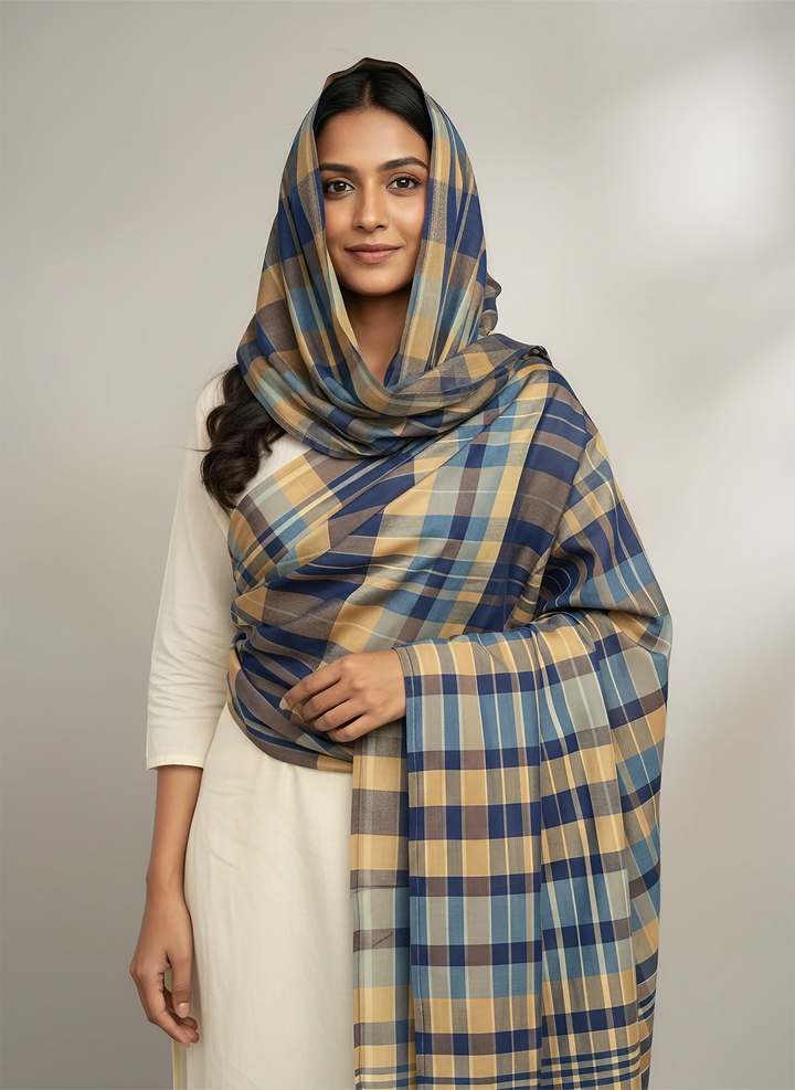 Enhance your traditional and festive looks with this cotton zari dupatta, beautifully woven with a modern checkered design in shades of blue, beige, and mustard. The subtle zari detailing adds a touch of shimmer, making it perfect for both everyday elegance and special occasions.