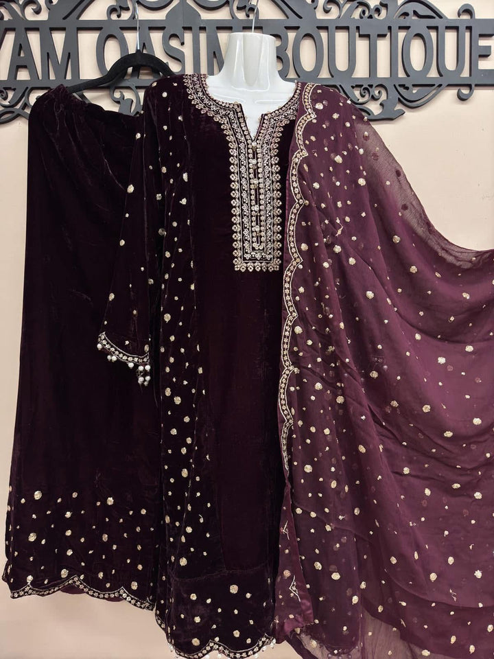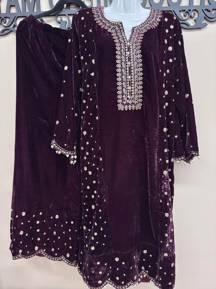 Experience timeless luxury with our Elegant 3-Piece Velvet Embroidered Ensemble, crafted to make every occasion special. This premium outfit features: