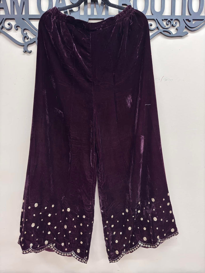 Embroidered Palazzo Trousers: Made from matching velvet fabric with elegant embroidery, offering a sophisticated wide-leg silhouette.