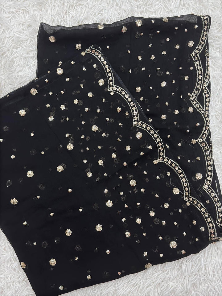 Chiffon Dupatta: Complementing black chiffon dupatta, fully embroidered with zari and sequins, bordered on two sides to complete the graceful look.