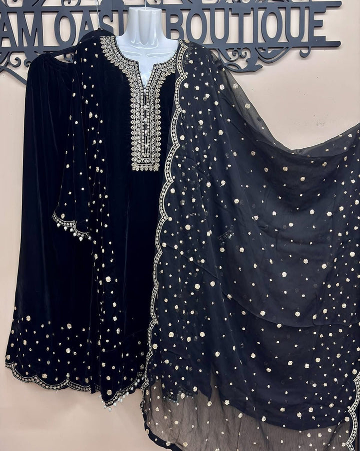 Elegant Black 3-Piece Velvet Embroidered Ensemble for Women – Luxury Formal Wear with Chiffon Dupatta
