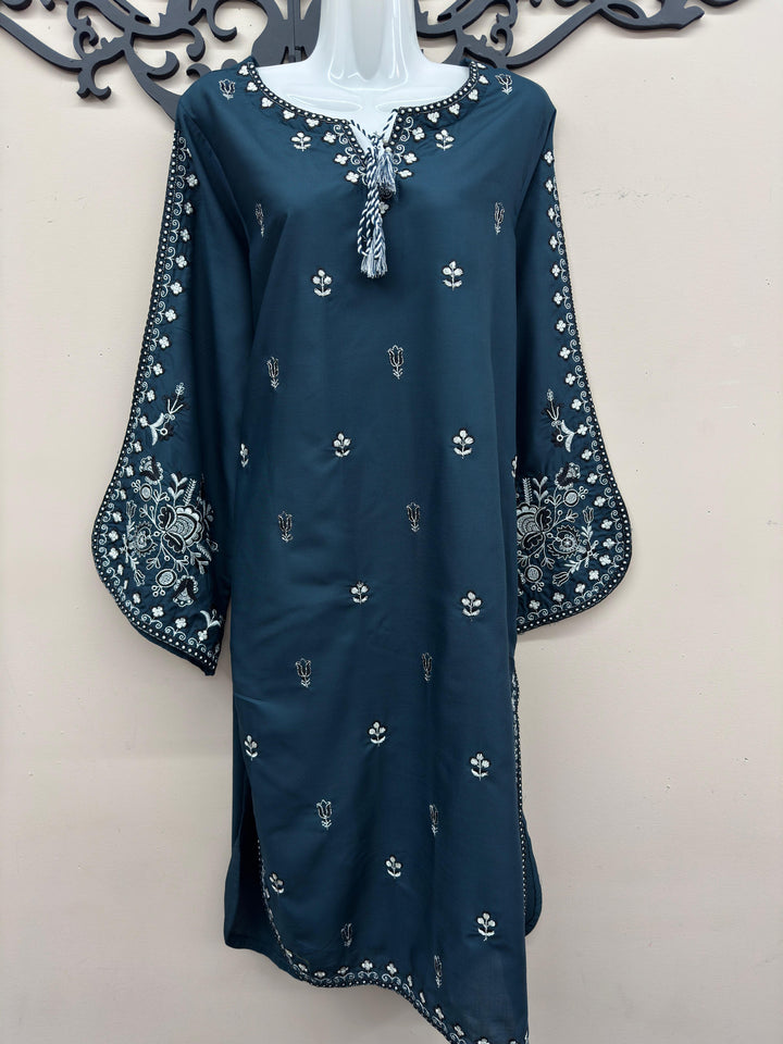 Intricate floral embroidery on the neckline, sleeves, and daman