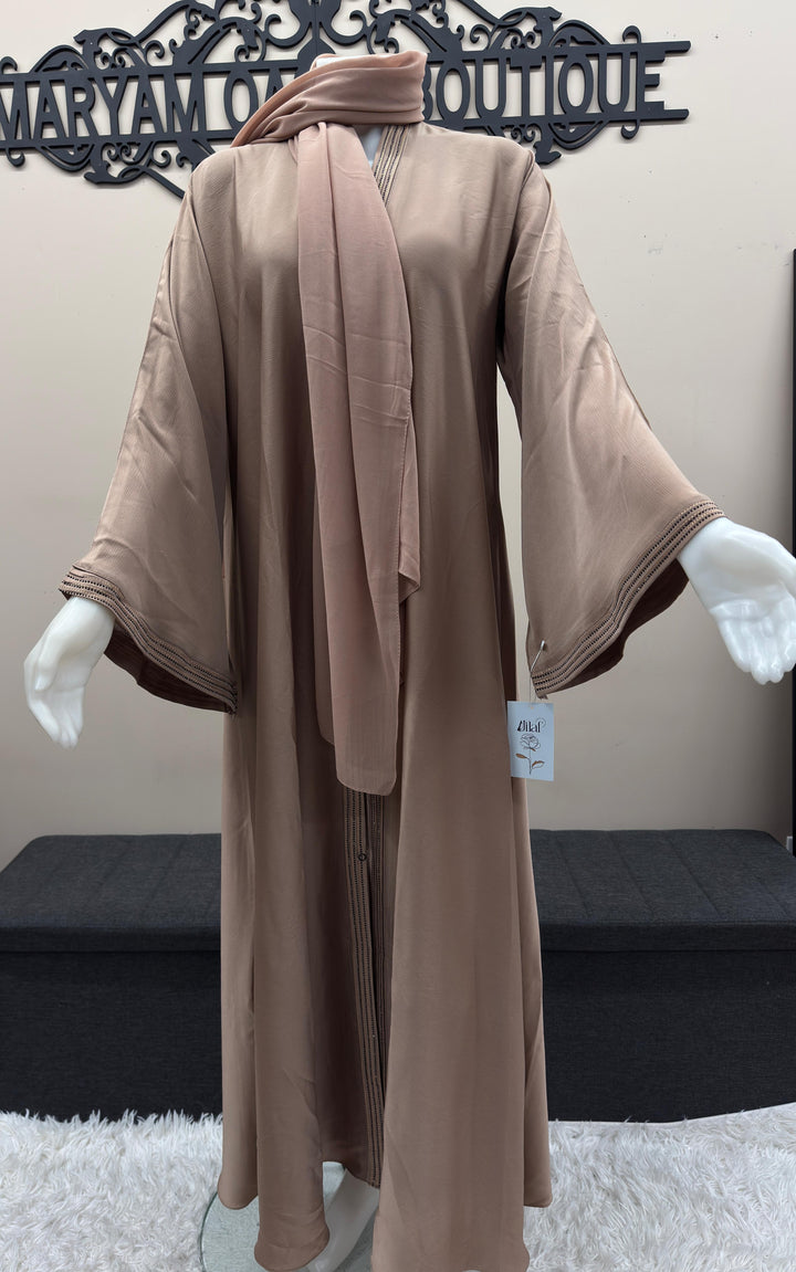 The standout bell sleeves add a touch of sophistication, while the front-open design allows easy layering and styling. Each piece comes with a matching scarf, completing your modest outfit with harmony and style.