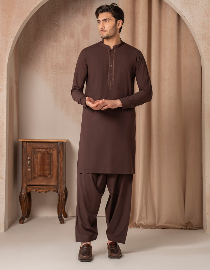 This dark brown blended semi-formal kameez shalwar offers a neat, stylish look that works well for family gatherings, dinners, or casual events. Easy to wear and effortlessly smart.