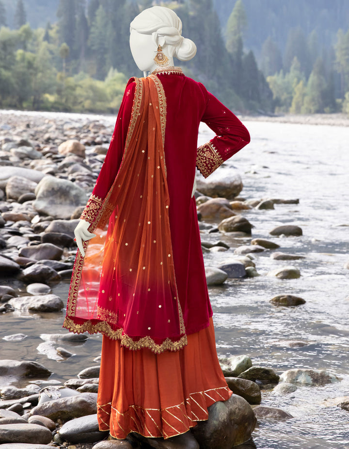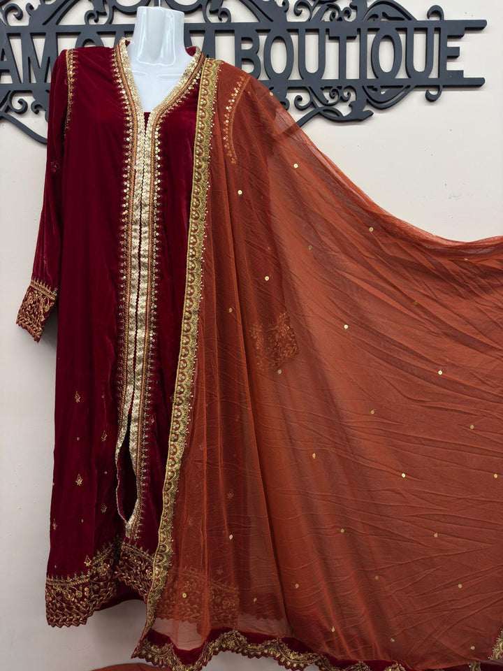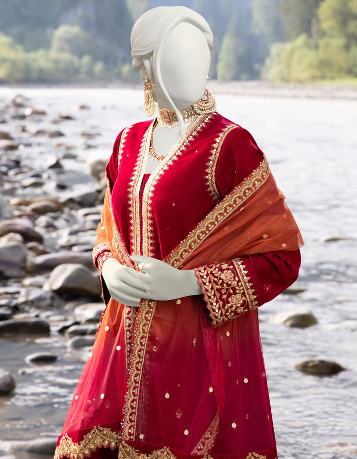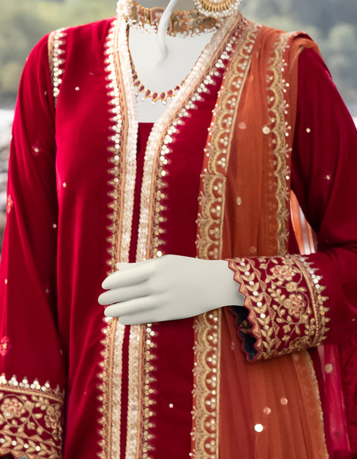The deep red hue radiates festive charm, while the outfit’s classic straight silhouette ensures a graceful look. Paired with matching velvet trousers and a complementing dupatta, this ensemble adds a touch of timeless beauty to your wardrobe.
