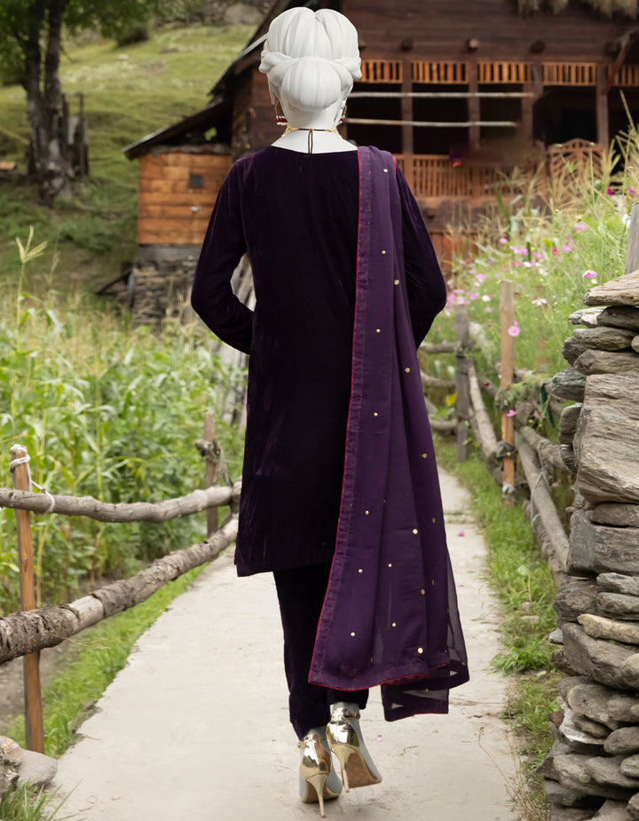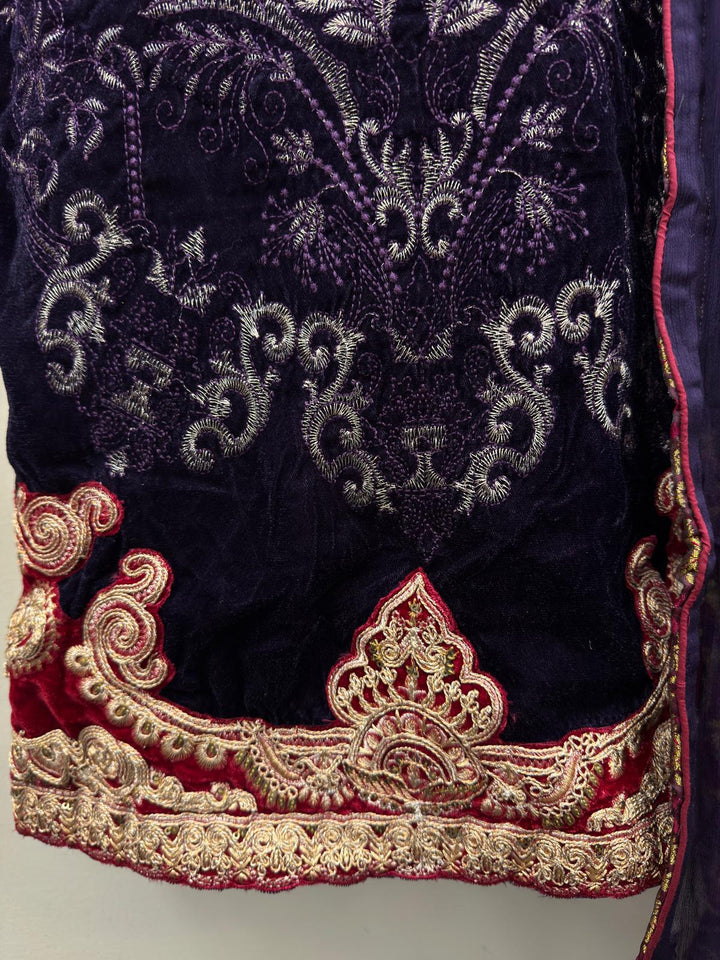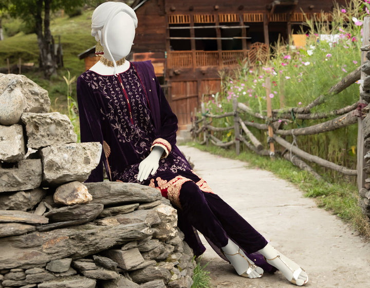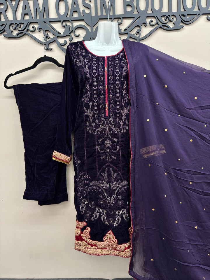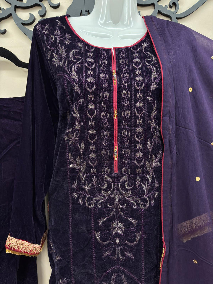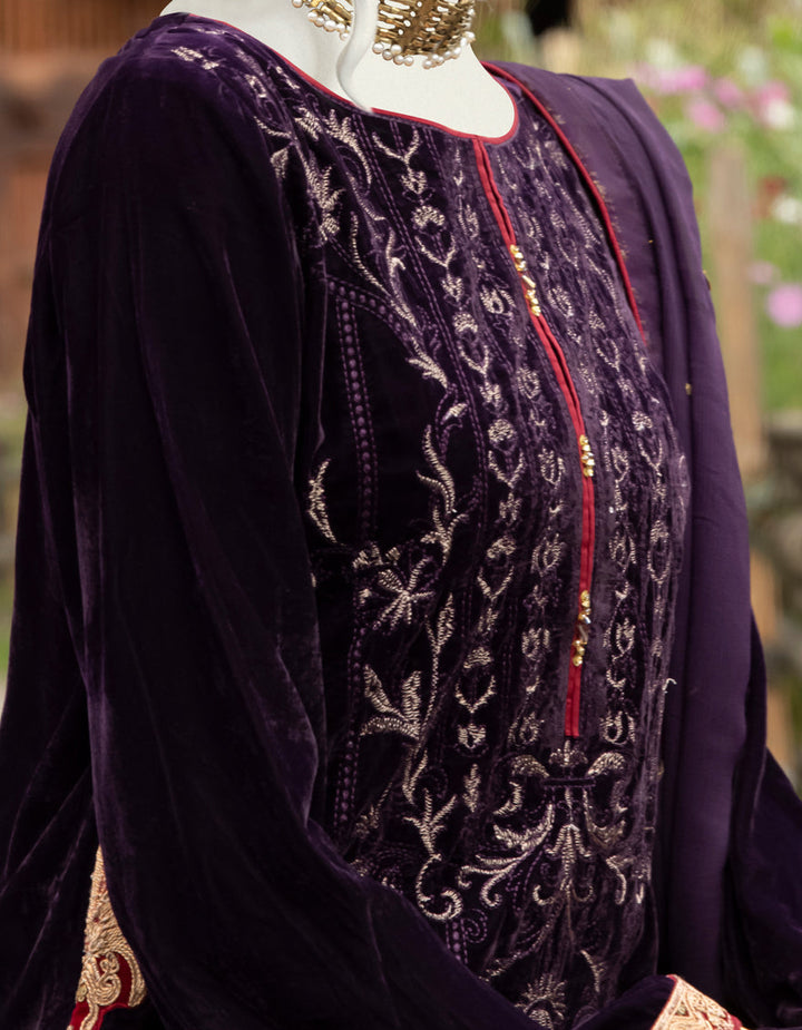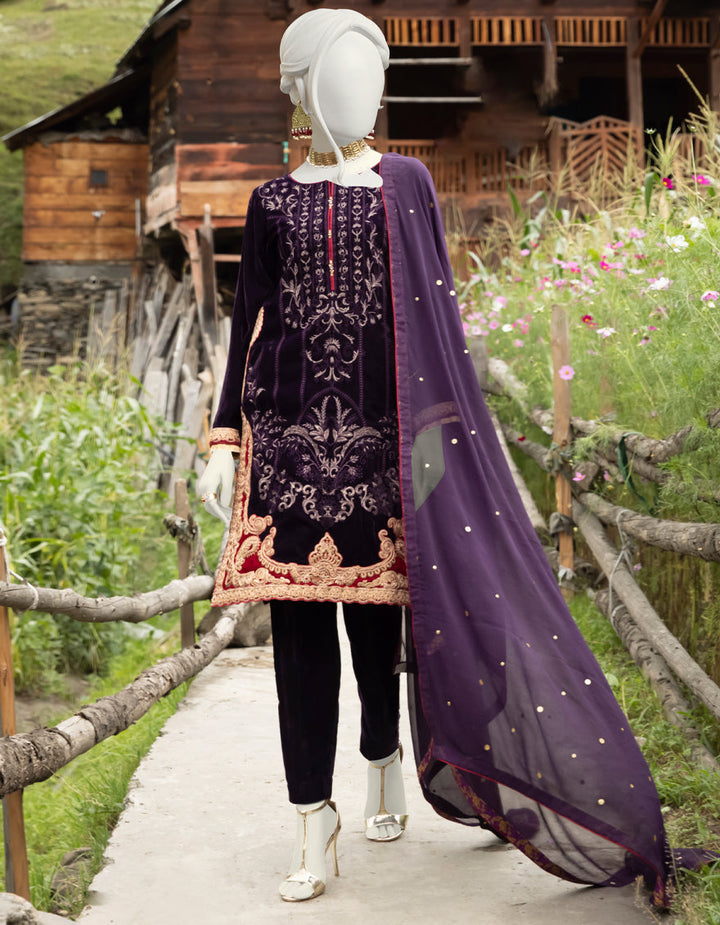 Redefine elegance this season with our Purple Velvet 3-Piece Stitched Formal Dress, a luxurious masterpiece crafted to perfection. Made from premium velvet, this outfit is adorned with rich golden and maroon embroidery on the front, sleeves, and borders, exuding a royal charm perfect for winter festivities.