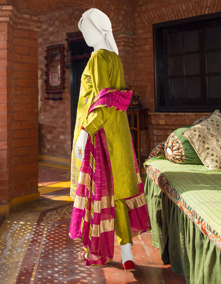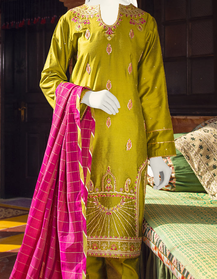 Elegant 3-piece cotton suit by Junaid Jamshed, featuring a beautifully designed cotton shirt, matching trousers, and a coordinated dupatta. The soft cotton fabric ensures comfort, while the classic design makes it perfect for everyday wear or semi-formal occasions.