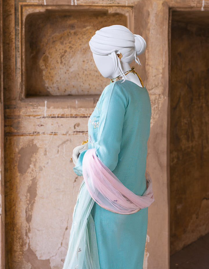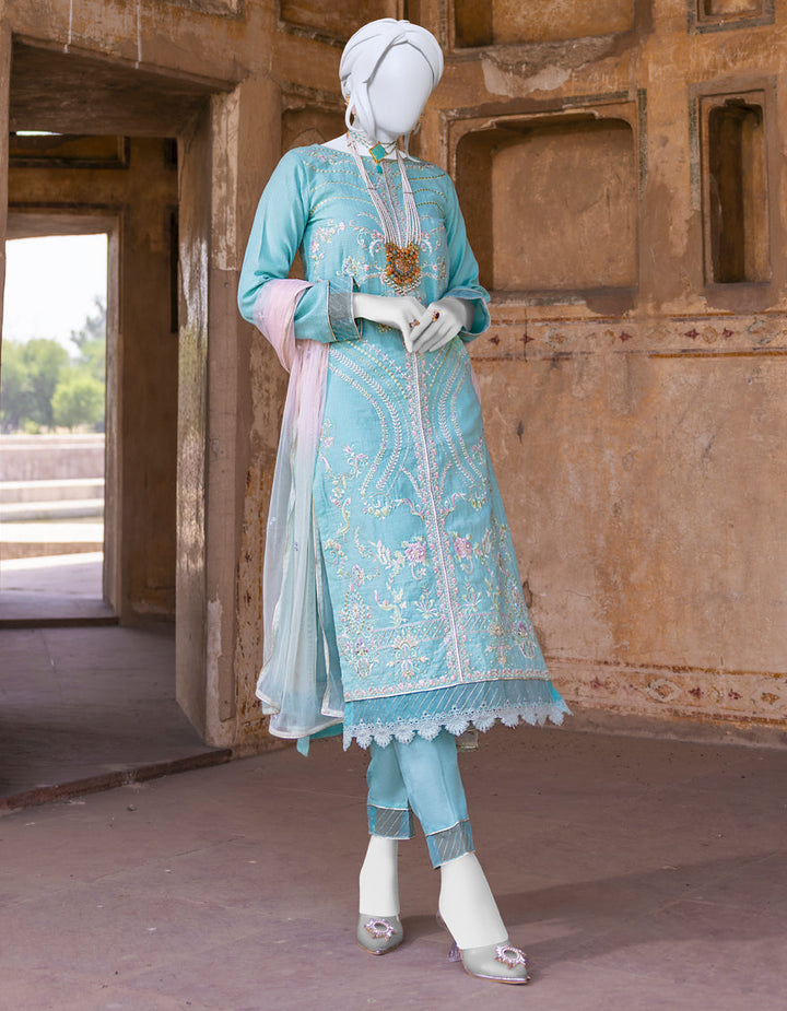Graceful 3-piece cotton suit by Junaid Jamshed (J.), designed in a soothing ice blue shade. The outfit features a finely tailored cotton shirt, matching trousers, and a lightweight dupatta, offering both comfort and elegance — perfect for everyday wear or casual gatherings.