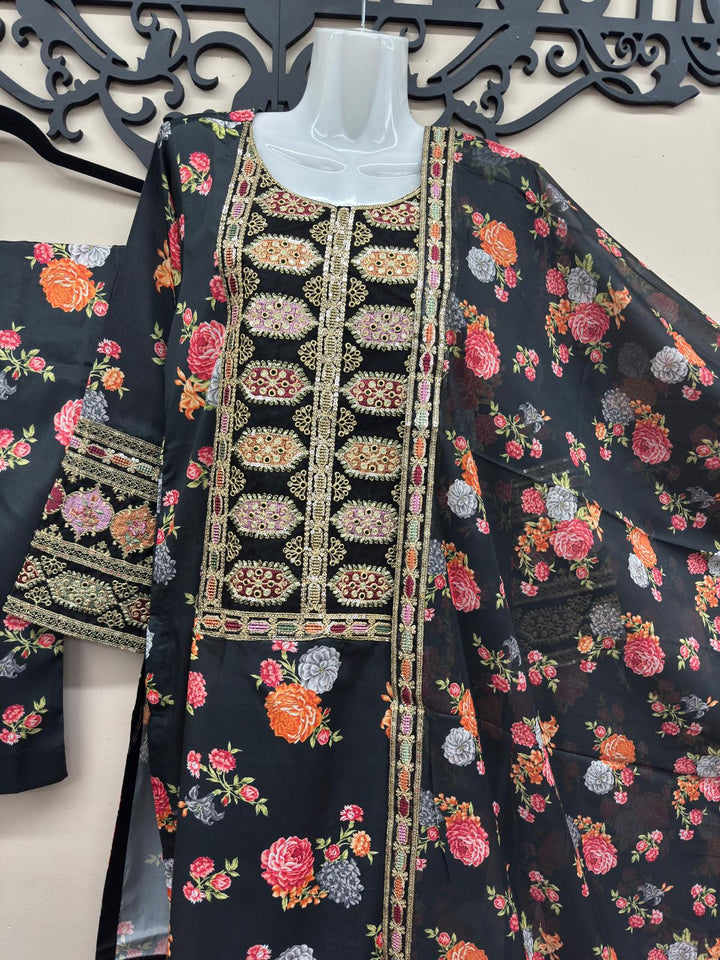 The outfit includes a matching black silk printed trouser and a stunning chiffon printed dupatta with a 3-side embroidered border, adding a luxurious finishing touch. Perfect for festive events, daytime gatherings, and sophisticated casual wear.