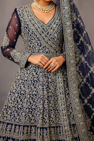 Navy Blue Heavily Embroidered Formal Gown Dress with Dupatta-Luxury Bridal Wear