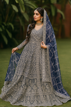 The full-length flared gown is crafted from premium net/chiffon fabric layered with all-over floral embroidery, ensuring a regal and timeless look. The full sleeves are richly embroidered and finished with detailed silver borders. A matching embroidered dupatta completes the ensemble, featuring delicate motifs and broad scalloped borders for that perfect graceful finish.