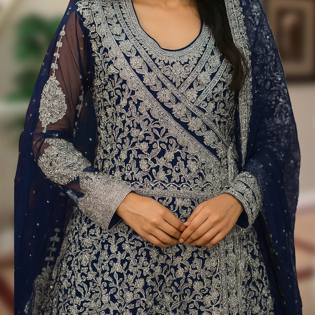 Step into royalty with this exquisite navy blue formal gown, a masterpiece of elegance and craftsmanship. Perfect for bridal, walima, or high-end events, this dress features a flattering wrap-style neckline adorned with intricate silver threadwork, sequins, and bead embroidery that cascades gracefully from top to hem.