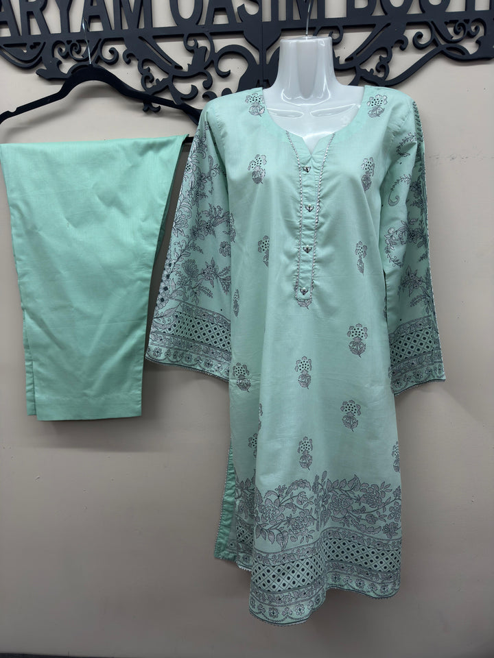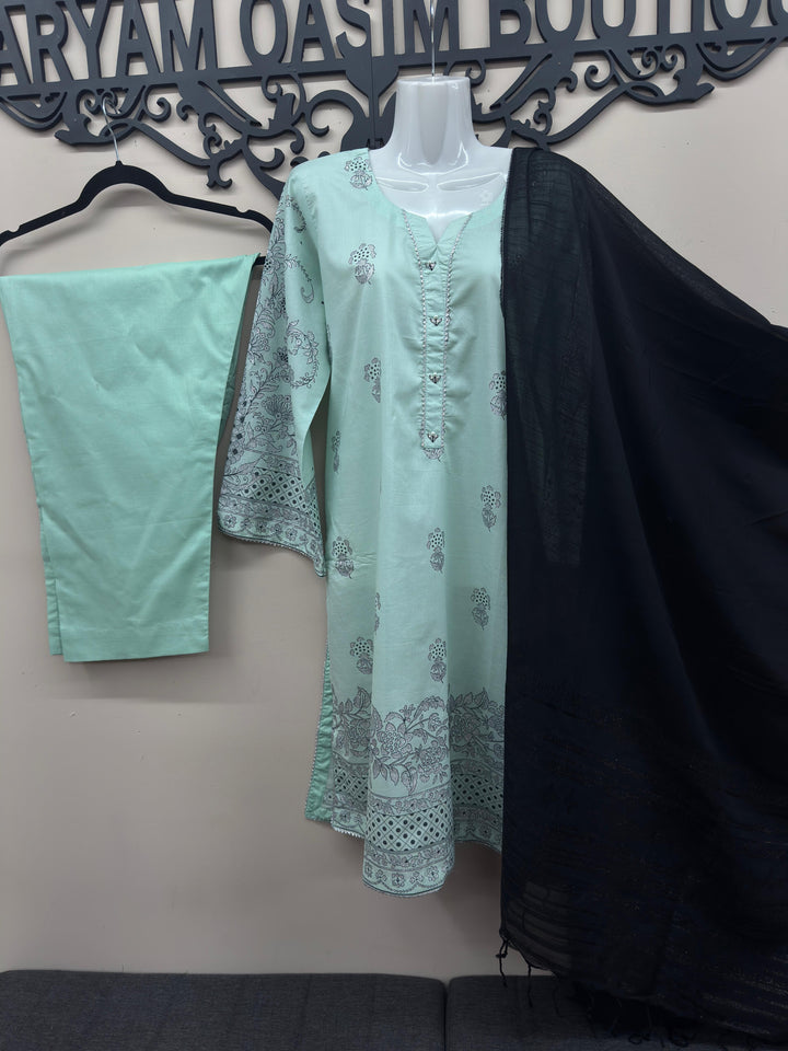 Crafted by Maryam Qasim Boutique, it features a block-printed lawn shirt, matching lawn dupatta, and lawn trousers—stitched with precise tailoring and graceful finishing touches.