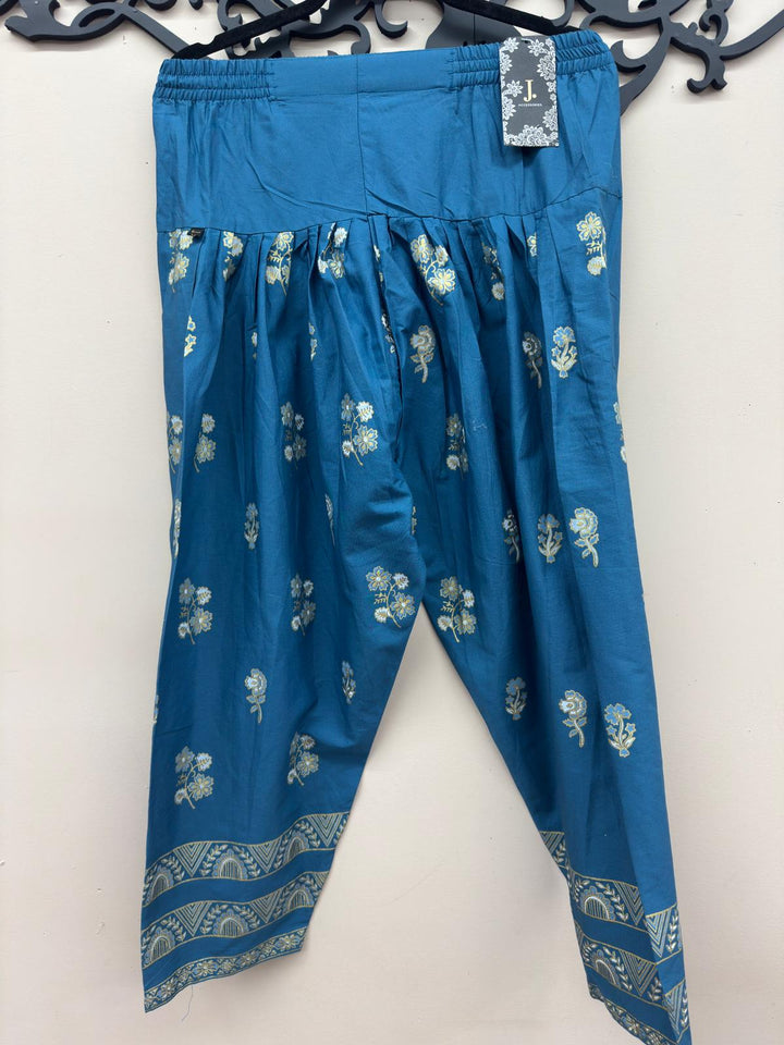 The shalwar features a stylish pancha button design, adding a chic touch to its traditional silhouette. Its elegant cadet blue color complements a variety of kurtas and tops, making it a versatile wardrobe essential.