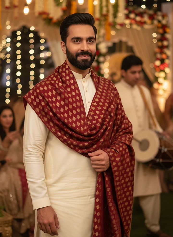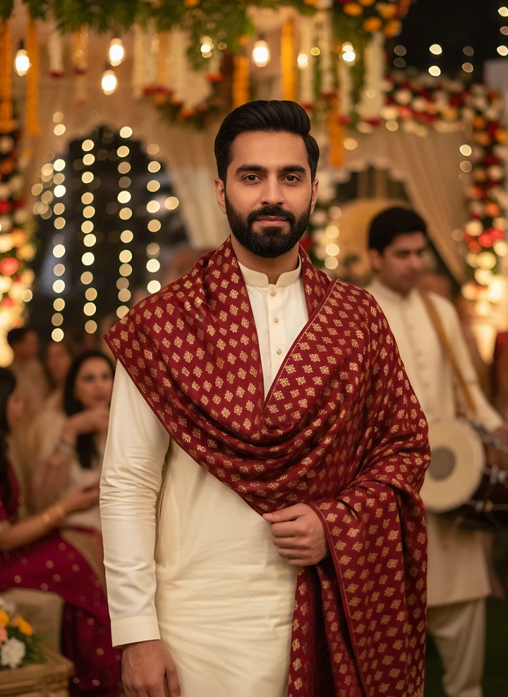 Add a royal touch to your traditional attire with this Original J. Maroon Groom Shawl, a perfect choice for grooms and wedding occasions. Beautifully woven with golden patterns, this 2.5-meter men’s shawl enhances any sherwani or shalwar kameez, offering a look of pure sophistication and class.
