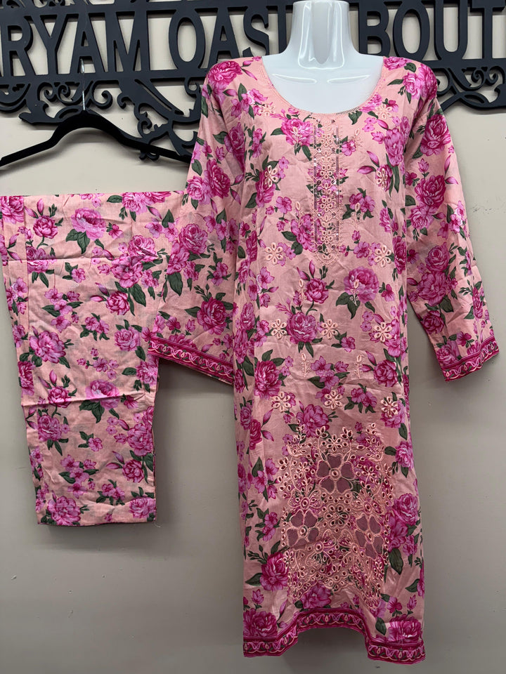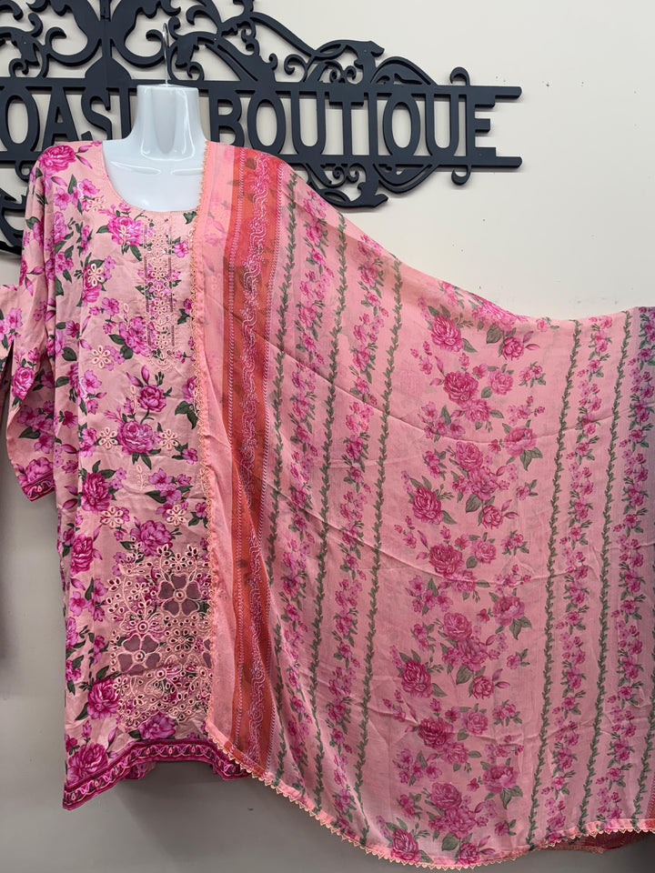 Step into effortless elegance with this pink floral 3-piece lawn outfit crafted for style and comfort. The shirt showcases a colorful floral print with an embroidered neckline, paired with matching lawn trousers for a coordinated look. A full-size chiffon printed dupatta with 4-side black lace completes this graceful outfit. Made from non-see-through breathable fabric, it’s the perfect choice for summer wear. Manufactured by Erum Eman