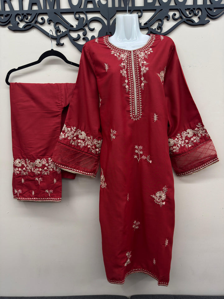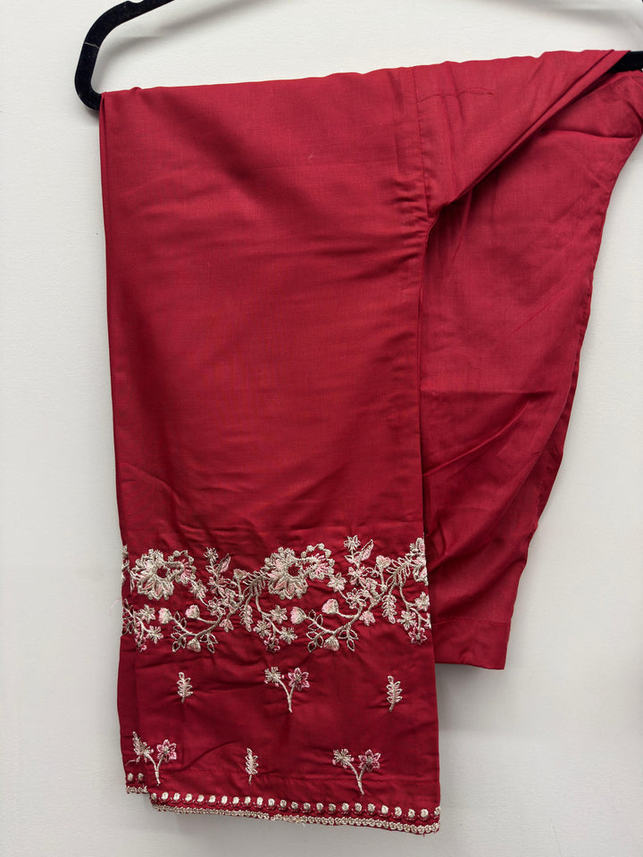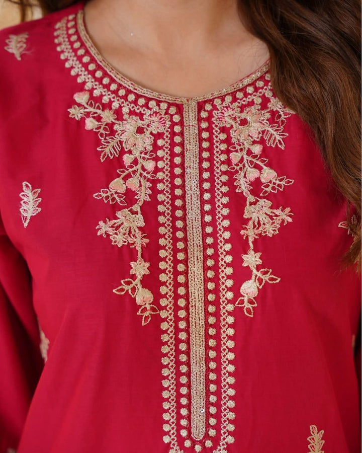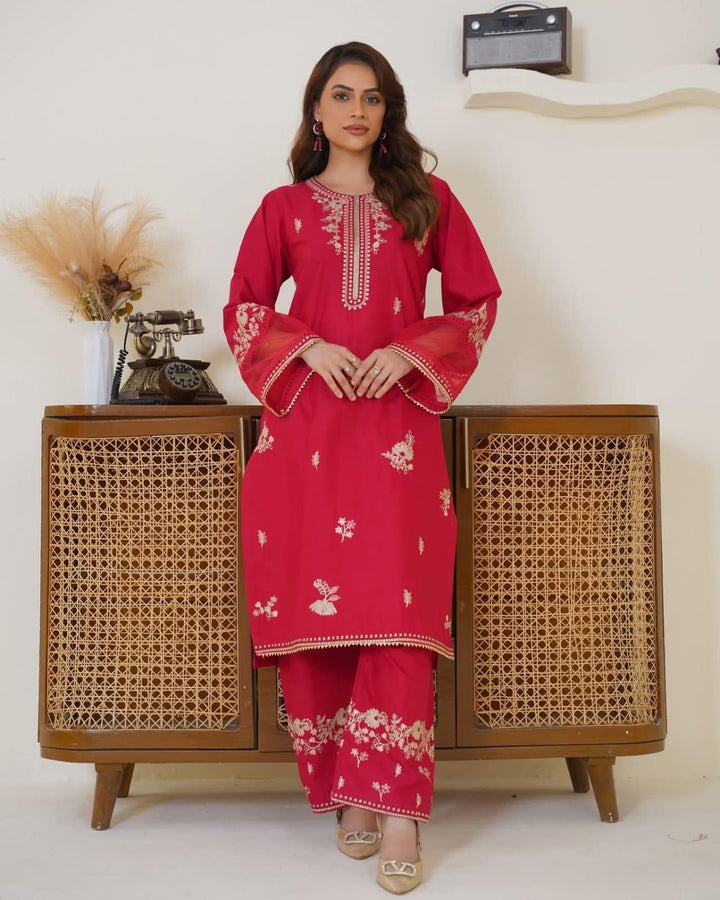 Make a bold statement with this X-Large Red Embroidered Cotton 2-Piece Suit, crafted from premium wash & wear fabric that blends comfort with timeless beauty. Designed for casual and formal occasions, this outfit exudes traditional charm with intricate embroidery and elegant gota lace detailing.