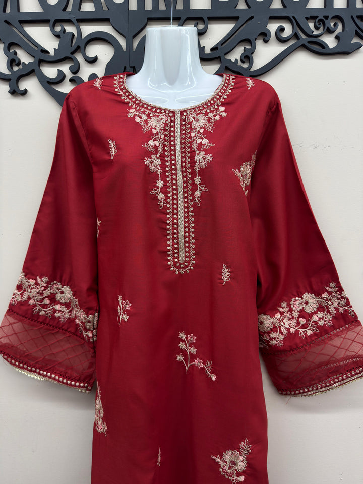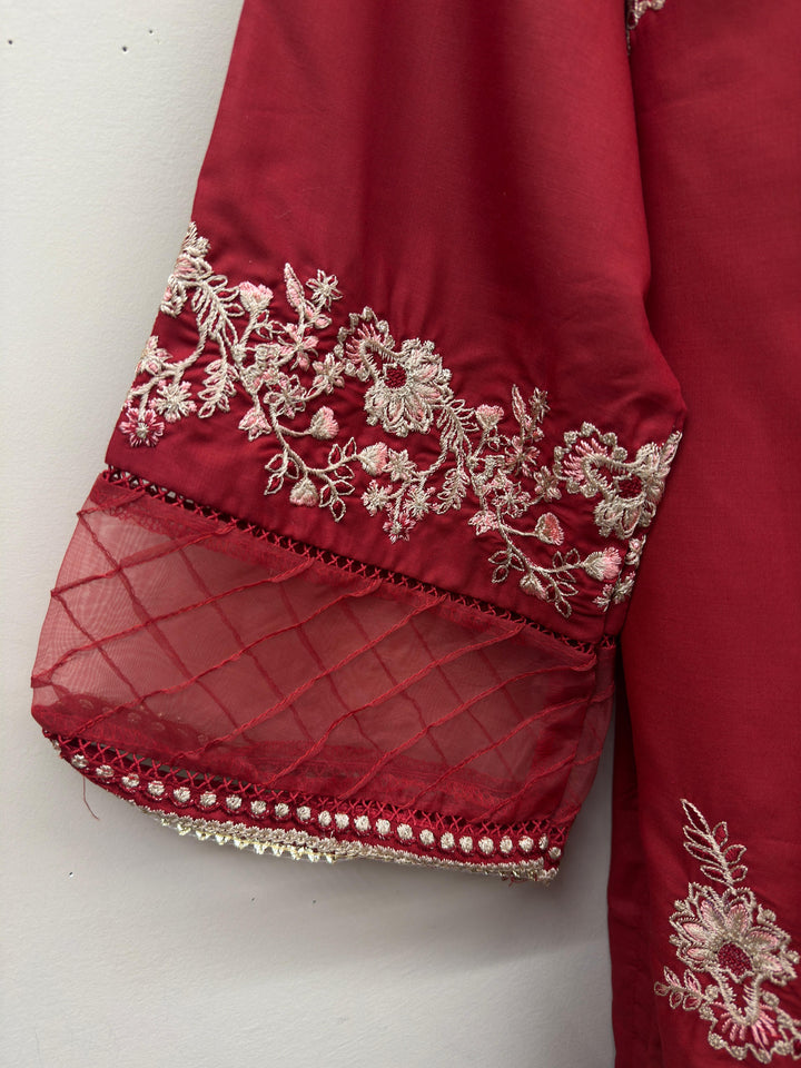 Stunning red color with sequin and Zaree embroidery on the front and neckline