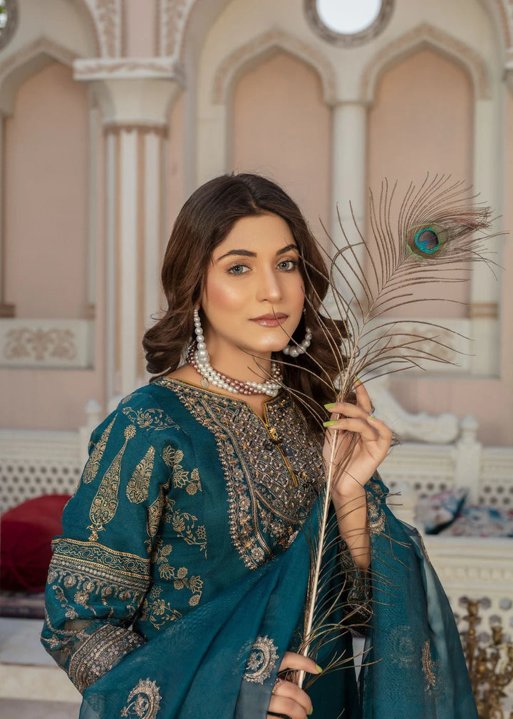 Step into refined sophistication with Ethereal Charm Zinc, a beautifully crafted 3-piece chiffon ensemble designed to elevate your festive and formal wardrobe. The teal chiffon shirt showcases intricate neckline detailing and delicate block printing along the side panels, creating an effortlessly graceful silhouette.