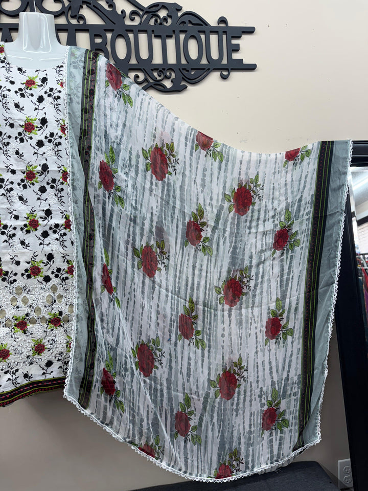 White Floral 3-Piece Lawn Suit with Embroidered Neck & Printed Chiffon Dupatta