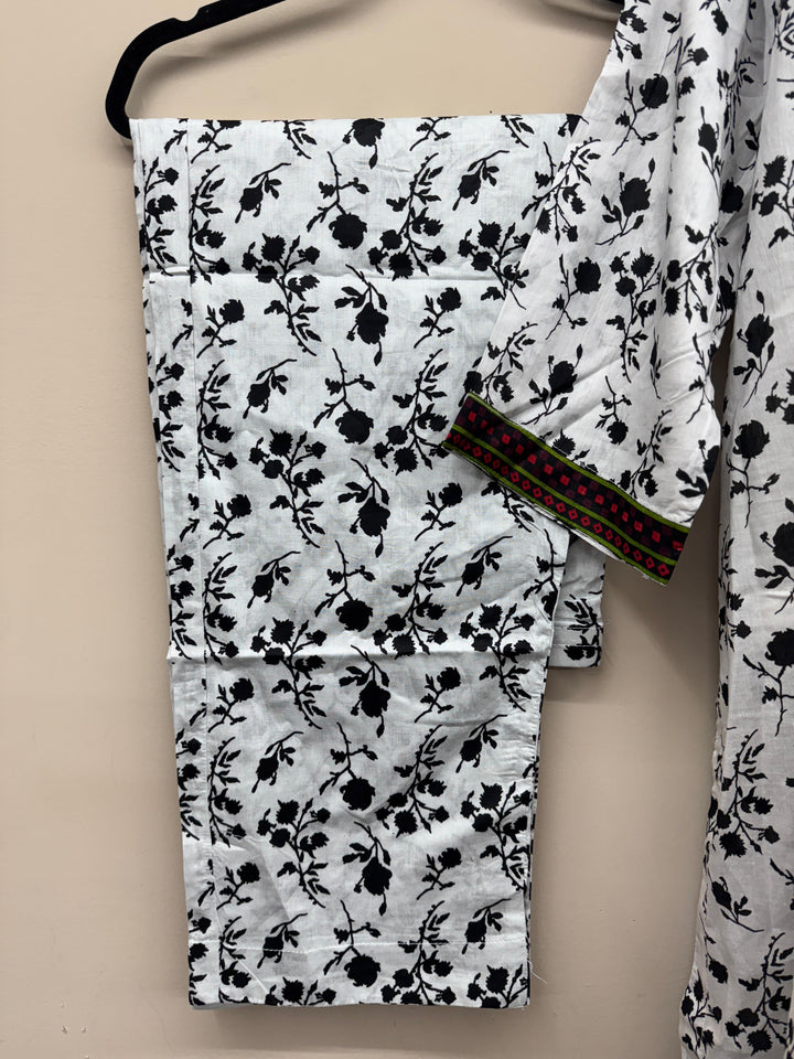 Stay effortlessly elegant this summer with this 3-piece lawn outfit designed for both comfort and style. The shirt comes with a beautiful floral print on front and back, enhanced with delicate neck embroidery for a graceful touch. Paired with matching printed lawn trousers and a full-size chiffon dupatta with four-side lace detailing, this outfit is perfect for casual and semi-formal summer gatherings.